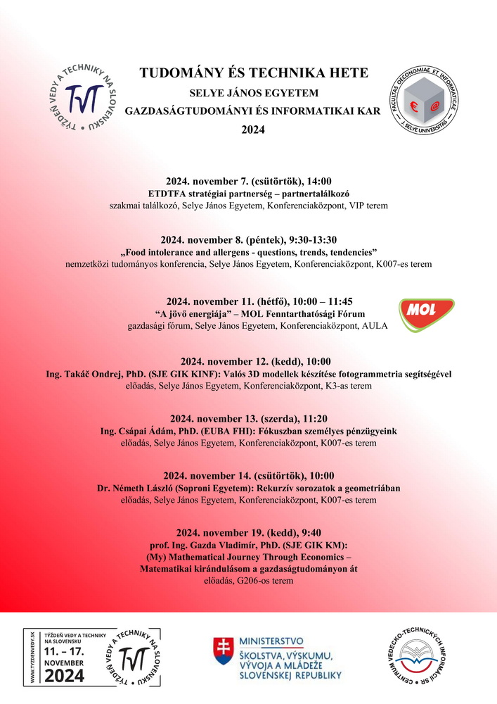 A Selye János Egyetem Gazdaságtudományi és Informatikai Kara kísérő rendezvények szervezésével hagyományosan, minden évben bekapcsolódik a Tudomány és Technika Hete rendezvénysorozatába. Idén az alábbi rendezvényekre várjuk az érdeklődőket: